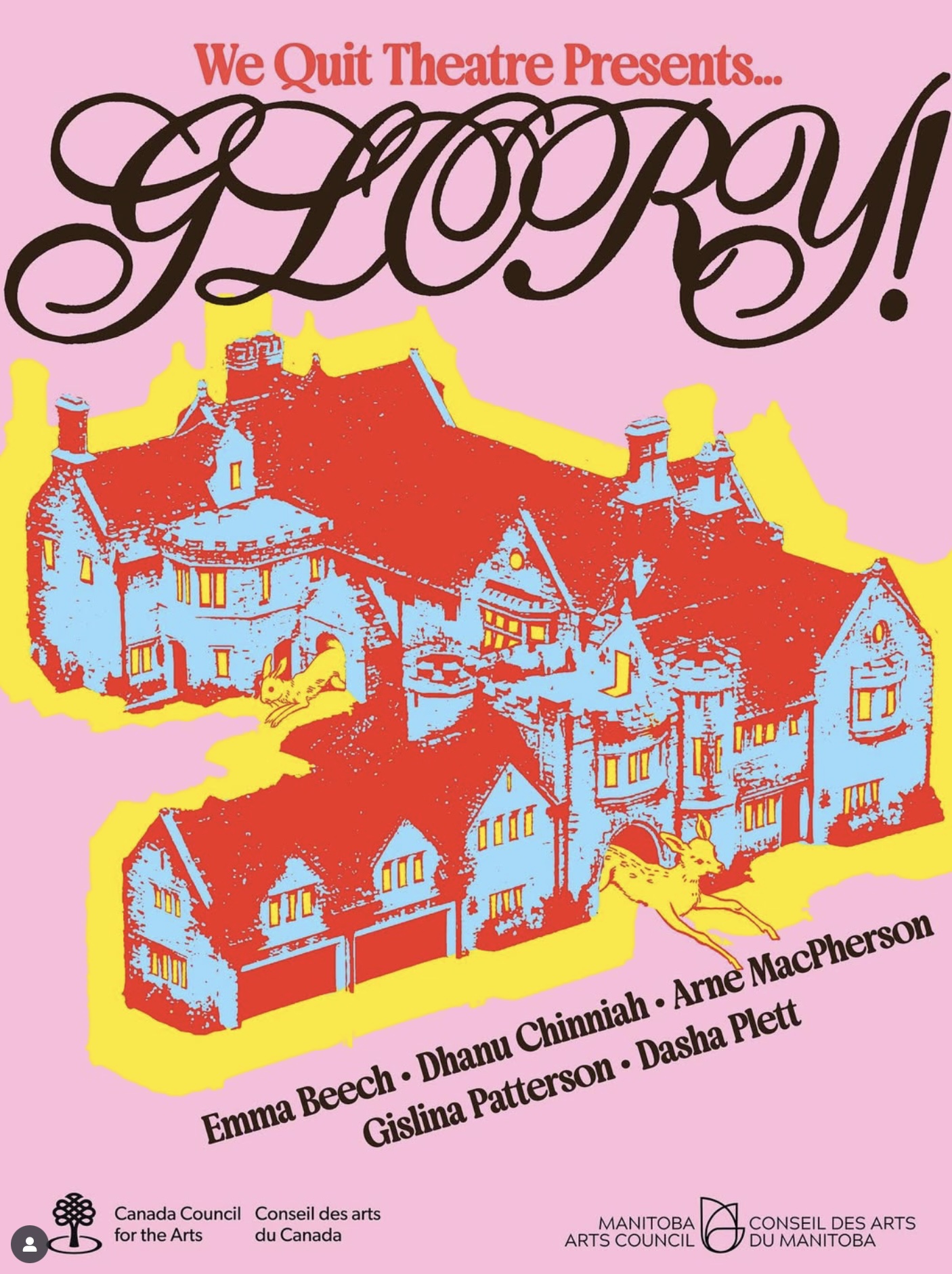 An audacious collective creation by award-winning, nationally touring Winnipeg theatre collective We Quit Theatre (Dasha Plett and Gislina Patterson), joined by collaborators Emma Beech, Arne MacPherson, and Dhanu Chinniah. An exciting hybrid of theatre, dance, and obsessive research, GLORY! mines the political, aesthetic, and libinal contradictions of the 70s to grapple with our present moment of crisis. Part late night Wikipedia wormhole, part underground performance art, part earnest exploration of what it means to be trans right now, GLORY! brings We Quit Theatre’s signature mix of delight, profundity, and iconoclasm to hometown audiences in this remarkable world premiere.